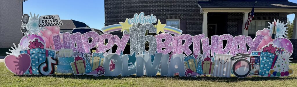 your favorites at NO EXTRA COST, and Our Big Yard Signs are the best around! We also offer the best customer service, working with customers on set-up times, display days, colors, styles, etc, all for a great low price! Get your Birthday Yard Sign, Welcome Home Yard sign, Graduation Yard sign, etc ordered now and watch the smiles appear!